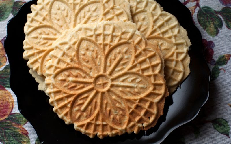 These delicate waffle cookies are cooked using a special iron and often flavored with anise, vanilla, or lemon zest.