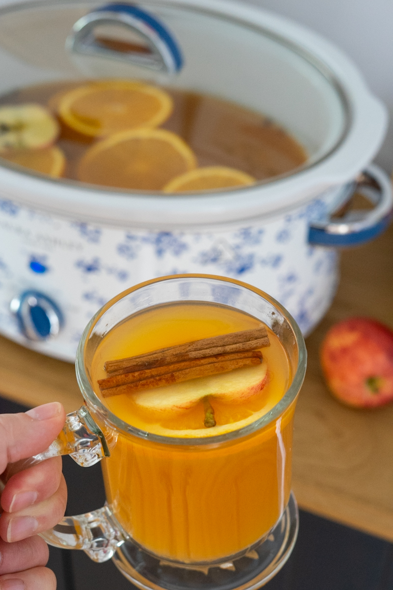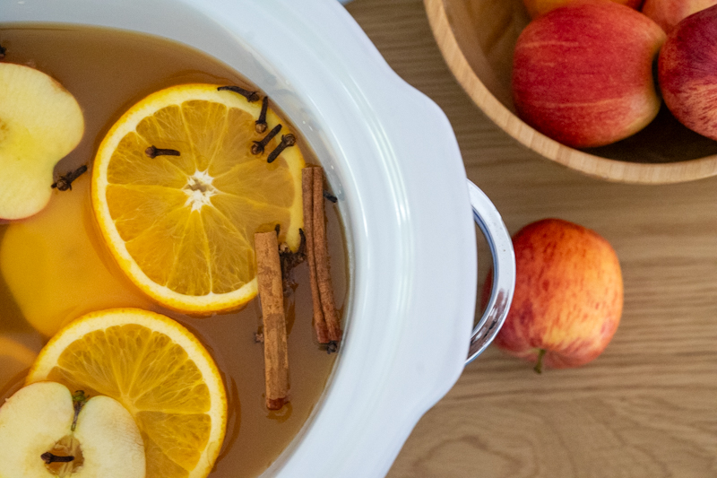 - Pour local apple cider into your slow cooker. Add cinnamon sticks, cloves, apple, and orange slices. Stir in maple syrup if desired.