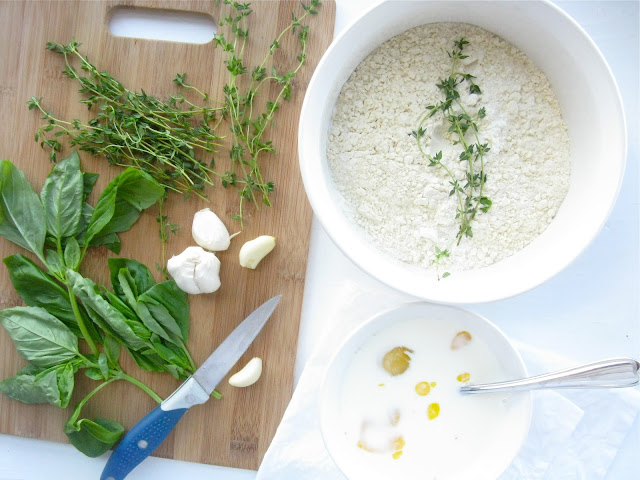 Then add in crushed & finely chopped garlic and minced herbs, with a pinch of salt.