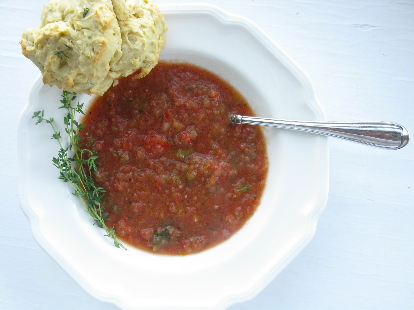 The season of crisp, juicy, flavorful vegetables is upon us. The market is lined with cucumbers, peppers, corn, tomatoes…just tons of goodness and  I really wanted to incorporate lots of fresh veggies into our meal, so I thought a gazpacho would be a perfect way to do that.