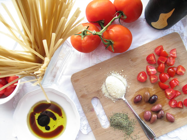 and balsamic vinegar as the olives are browning. Â Add cherry tomatoes and herbes de provence (pinch of salt, optional). Â Bring heat down to medium, stir and cook for 8 minutes. Â Bring heat to low, let simmer