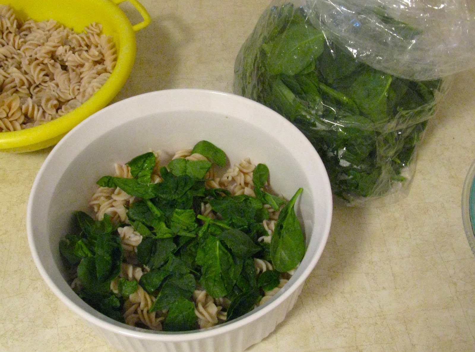 catching up with events of the week, and having lots of laughs. This recipe is a cinch and tastes delicious. Everything is pre-cooked, except the fresh spinach. Here’s what you want to do: